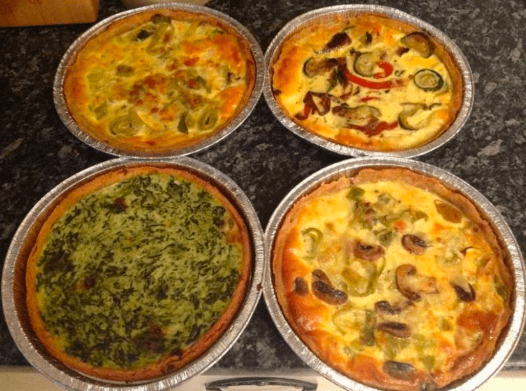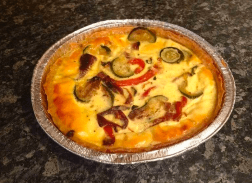 Add veggies to half-fill the tin, pour egg mixture over, and top with vegan cheese.
